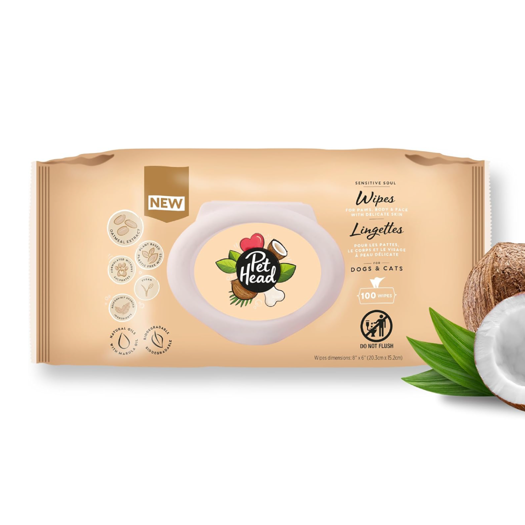 Keep dogs and cats feeling fresh, clean and comfortable with Pet Head Sensitive Soul Wipes. Designed for quick everyday clean-ups, these convenient wipes help remove dirt and debris from the coat, paws, body and face without the need for water. With 100 wipes in each pack, they offer an easy way to keep dogs and cats tidy between baths while supporting sensitive skin with a soothing, nourishing formula.